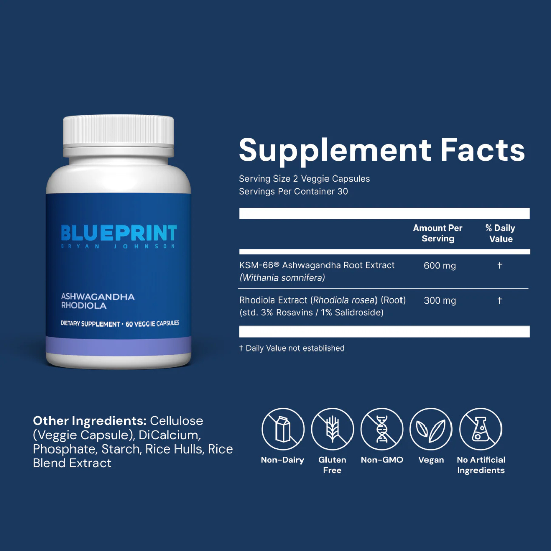 Non-GMO and gluten-free, Blueprint Ashwagandha + Rhodiola is rigorously tested for heavy metals and contaminants, ensuring you get clean, effective, and high-quality supplement to support you wellness routine.