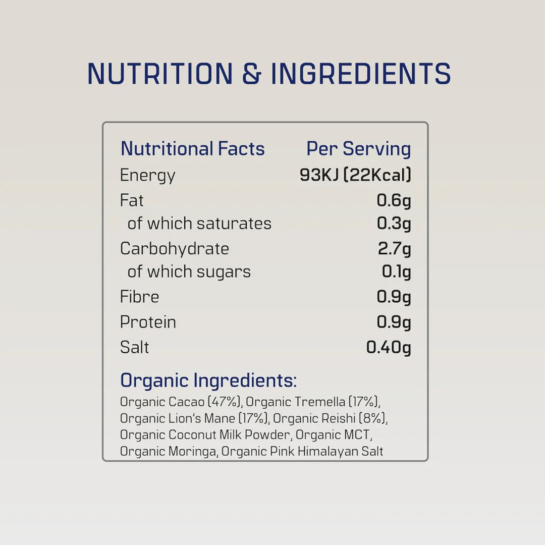 DIRTEA's Cacao's special blend contains quality ingredients including reishi, magnesium, turkey tail and more. It supports immune and cognitive health, enhances your mood, and promotes deep, restorative sleep.