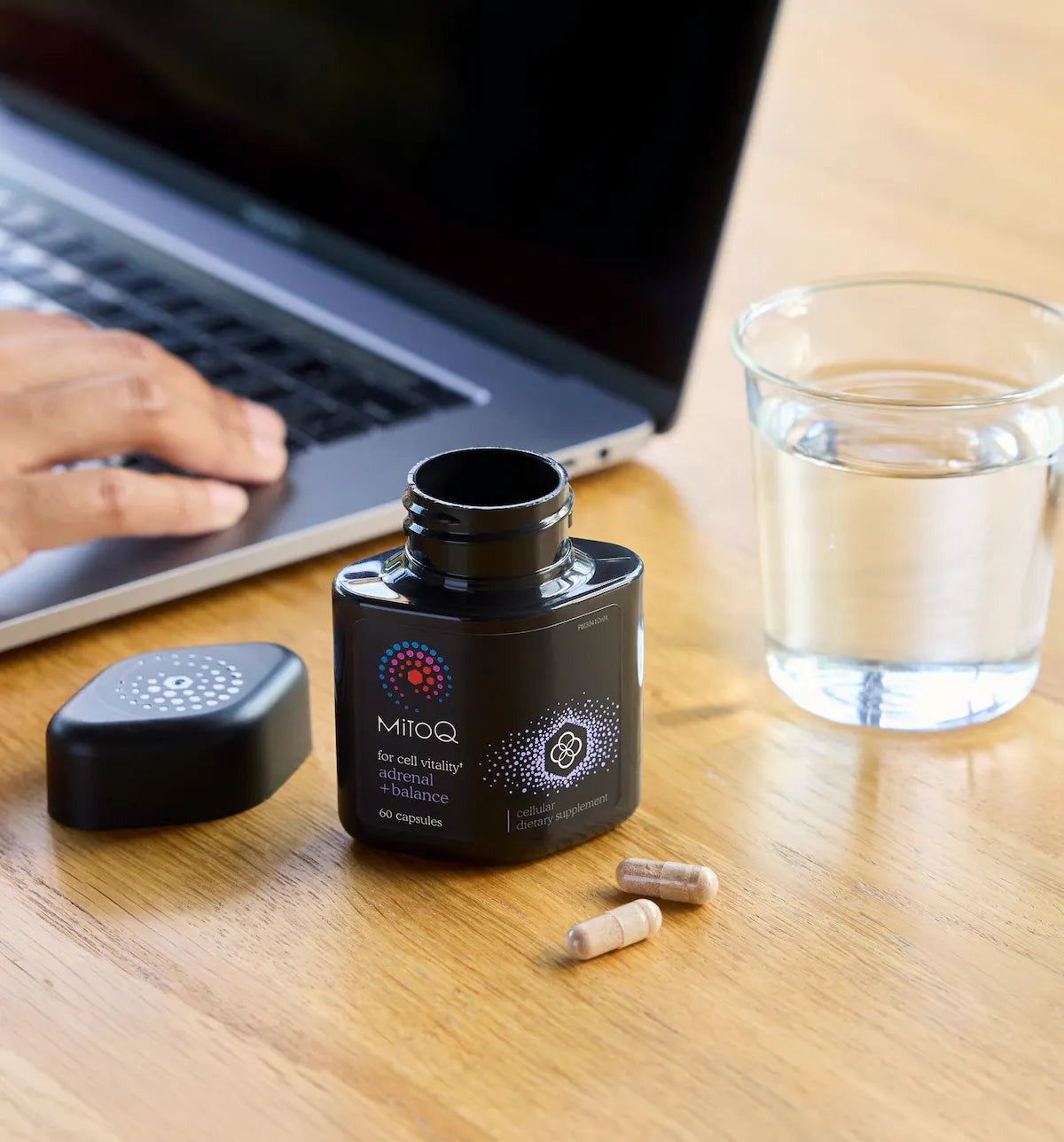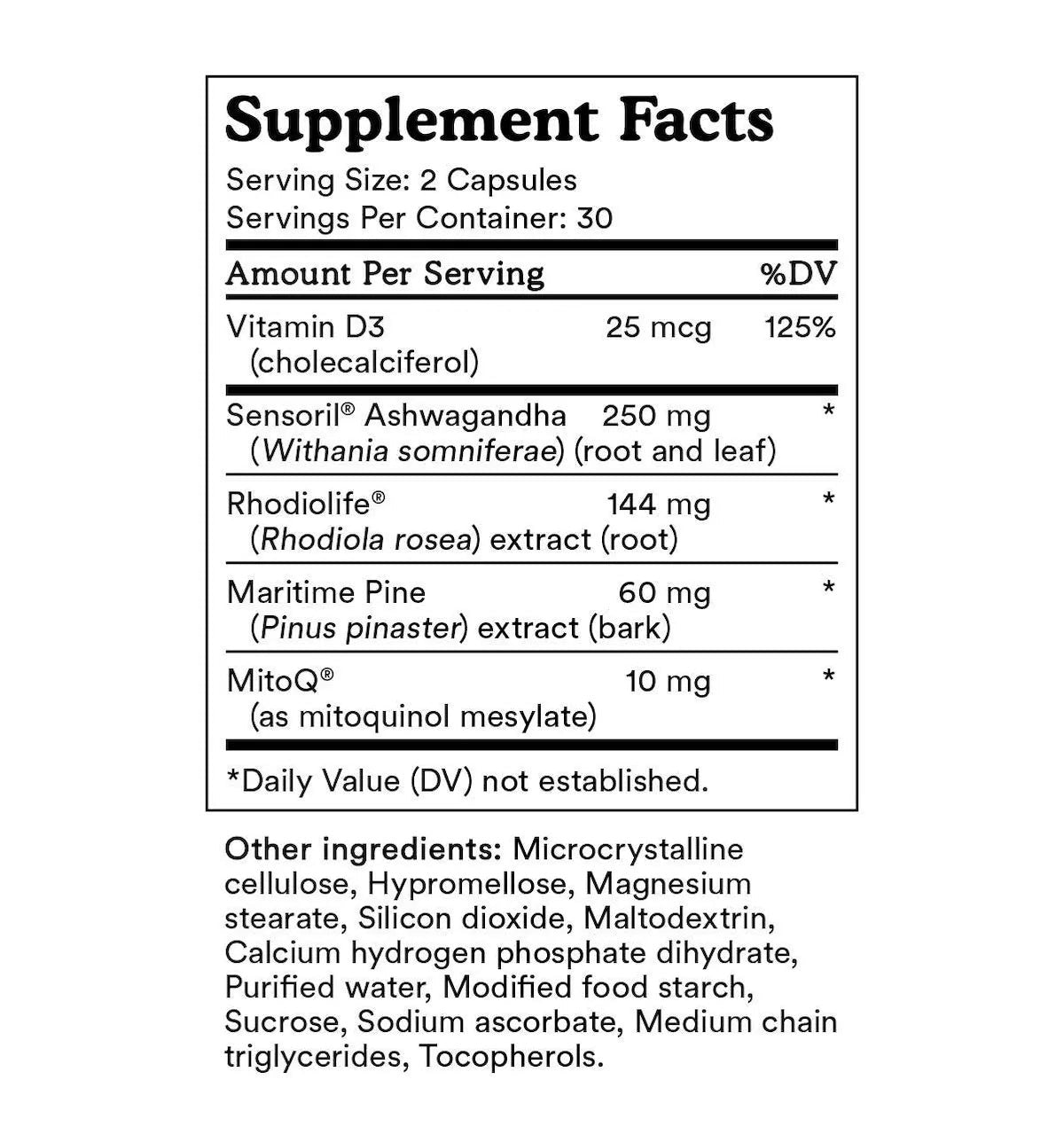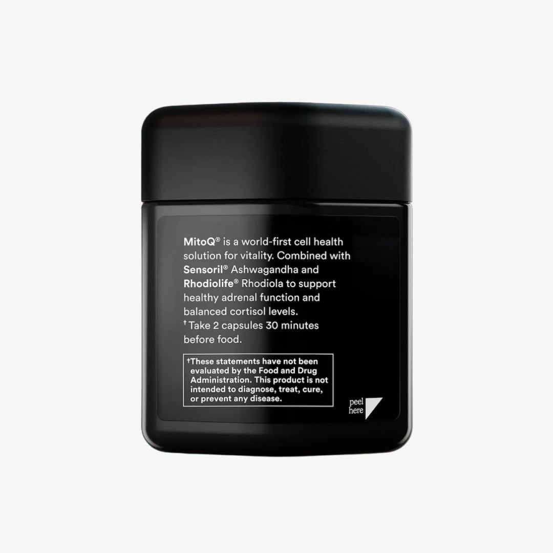 Ashwagandha, Rhodiola and Maritime Pine enhanced with MitoQ for a powerful combination made to support healthy adrenal function and balanced cortisol levels.
