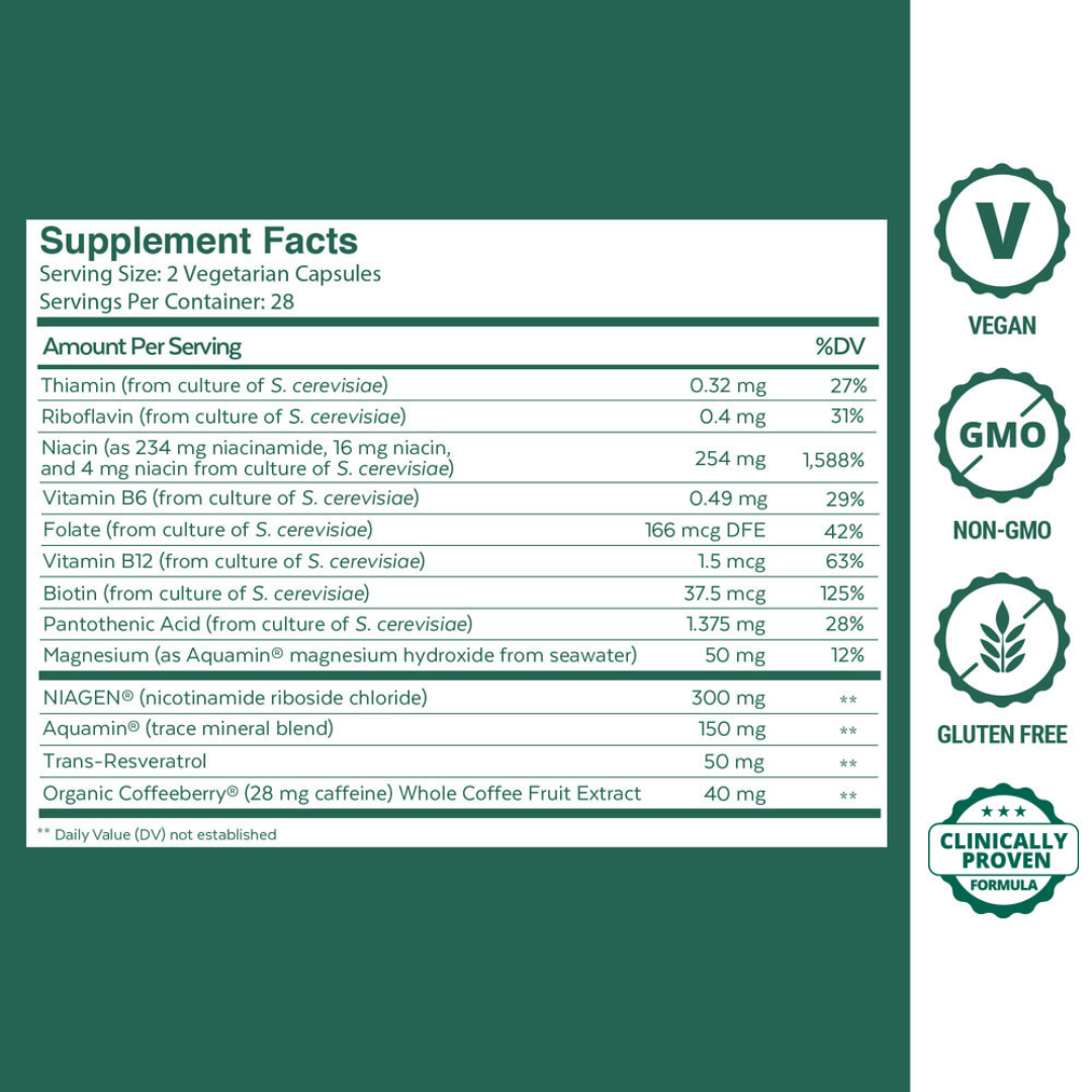 Organic Coffeeberry (28 mg caffeine) Whole Coffee Fruit Extract: Organic Coffeeberry delivers standardized levels of caffeine and naturally-occurring fruit polyphenols. It supports an essential enzyme in NAD+ production and supports cognitive performance.