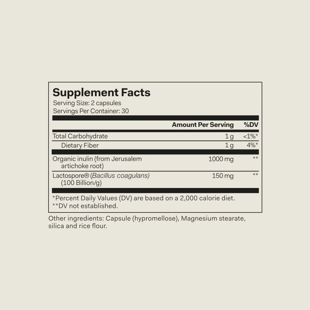 A vegan blend of 15 billion-spore dose probiotic and prebiotic inulin derived from 100% organic chicory root. Unlike live bacteria, which is often dead upon arrival, this room-temperature-stable blend doesn't start working until it reaches your small intestine.