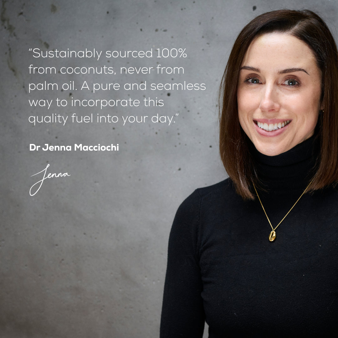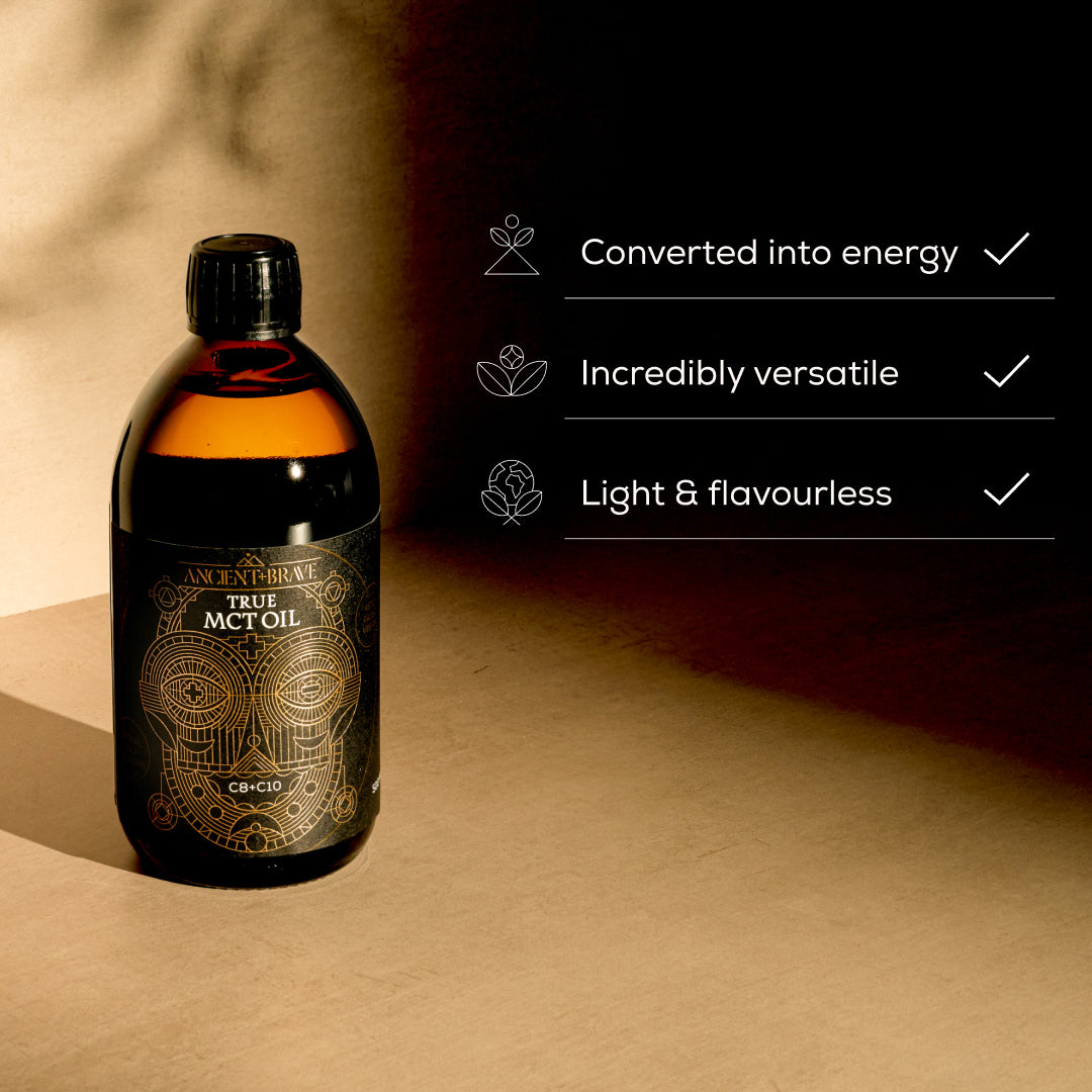 Our True MCT oil provides a beautifully balanced blend of 60% C8 (caprylic acid) and 40% C10 (capric acid) which is clean, light and flavourless. Entirely sourced from coconuts with no palm oil.