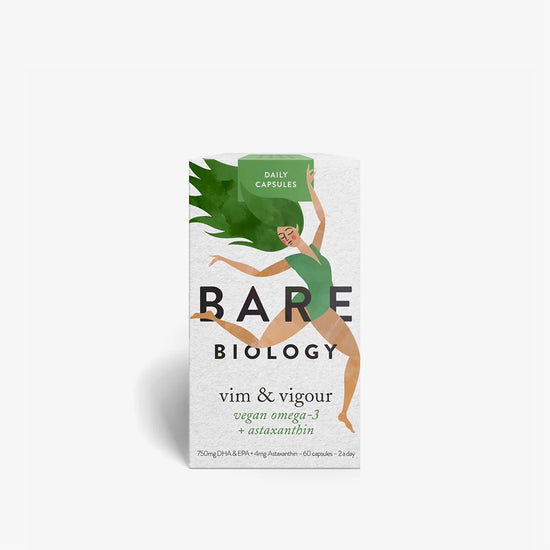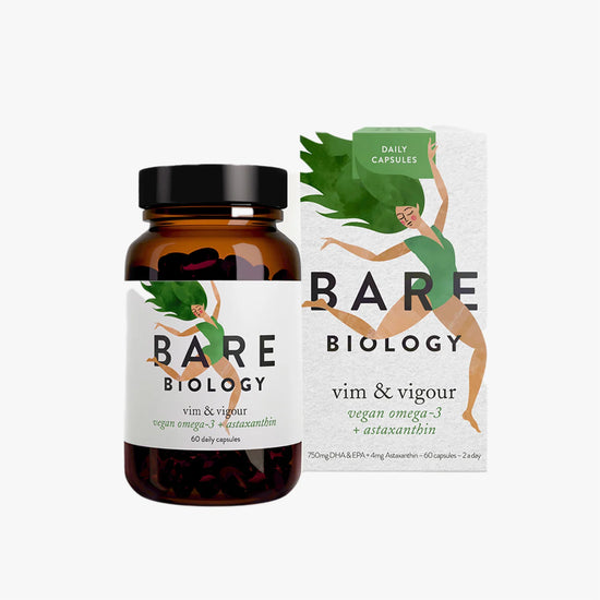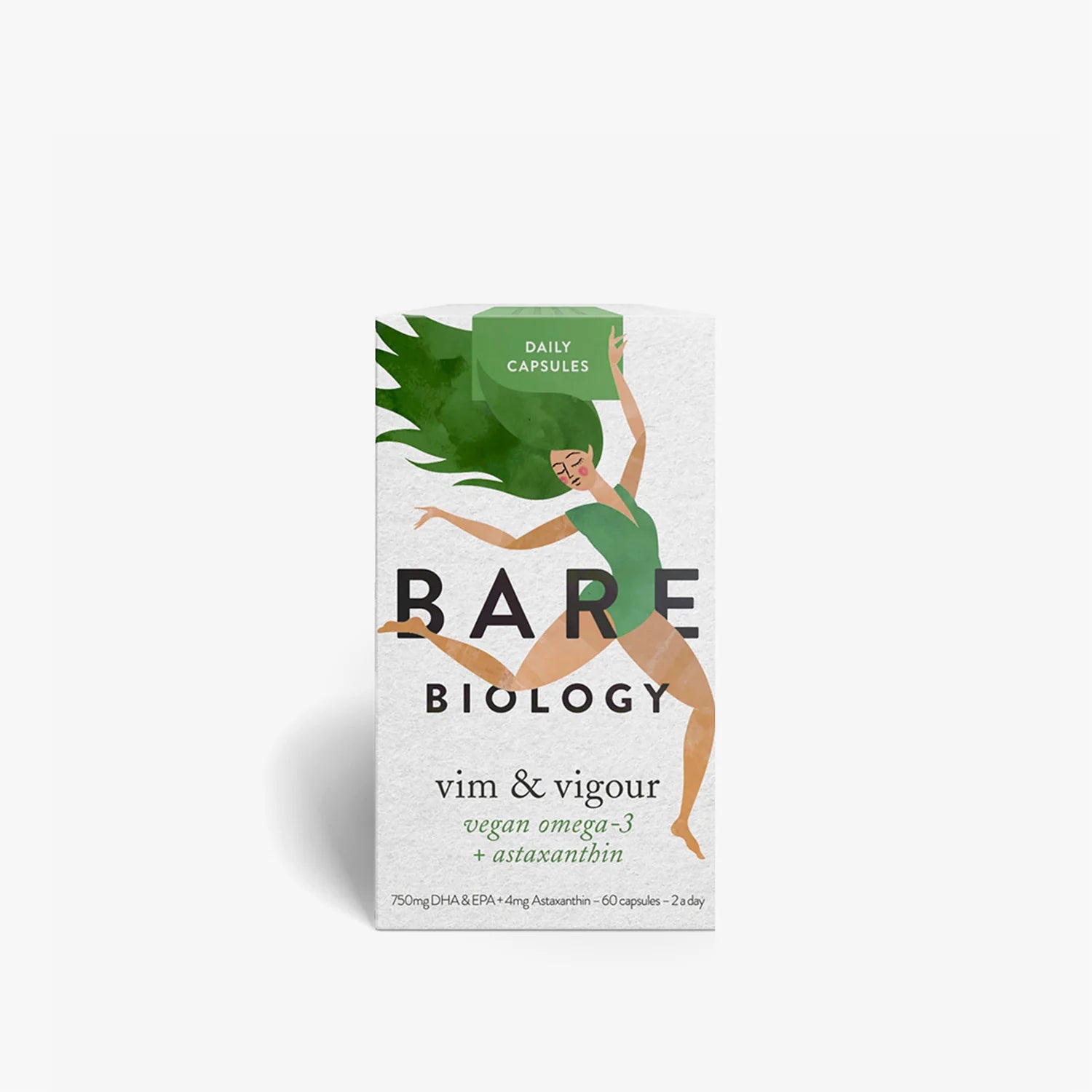 Bare Biology Vim & Vigour, Vegan Omega 3 + Astaxanthin are vegan omega 3 capsules, made from natural algae oil and rich in the essential fatty acids DHA and EPA that support brain, heart and eye health.