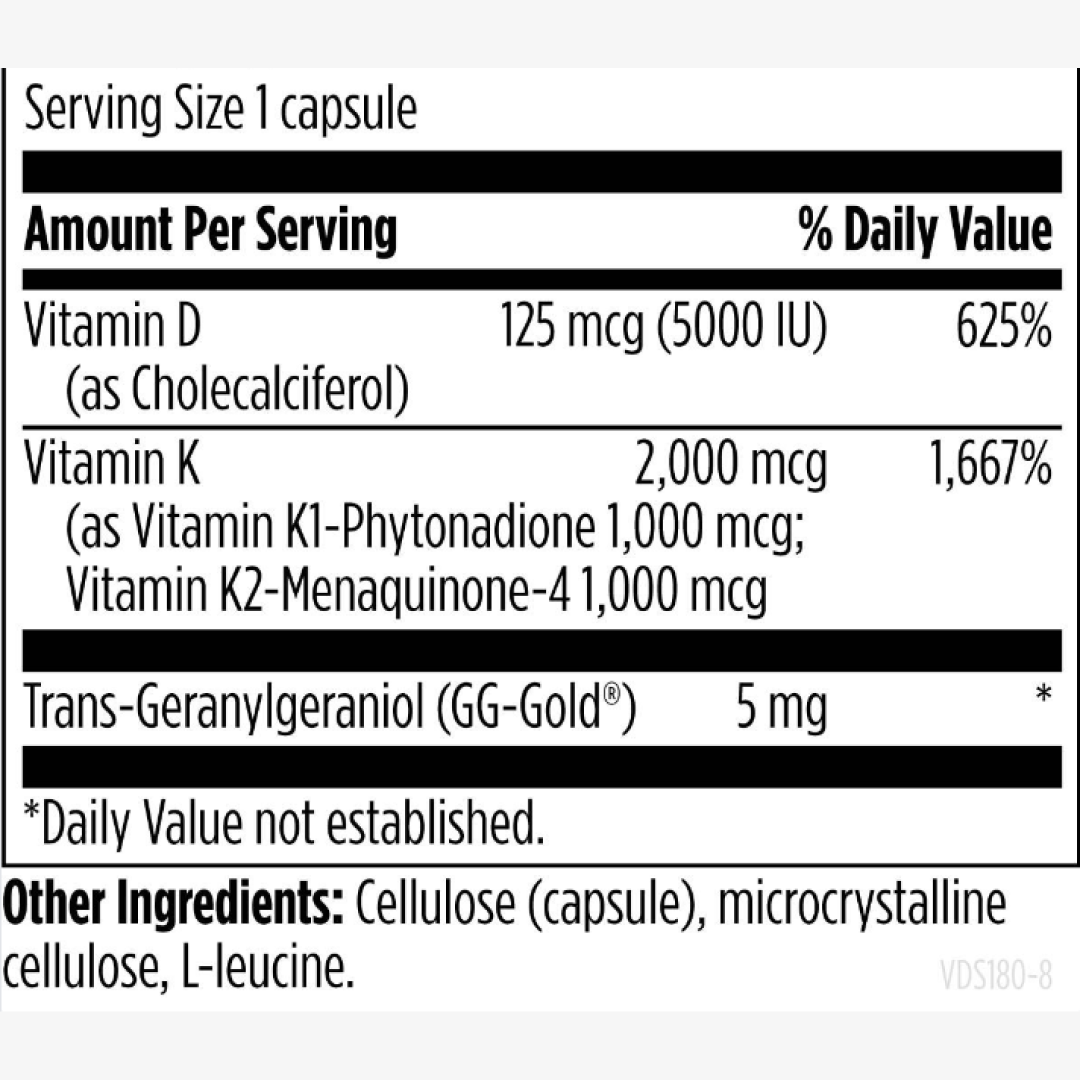 - Provides targeted quantities of vitamin D3 and K (K1 and K2) and geranylgeraniol (GG)